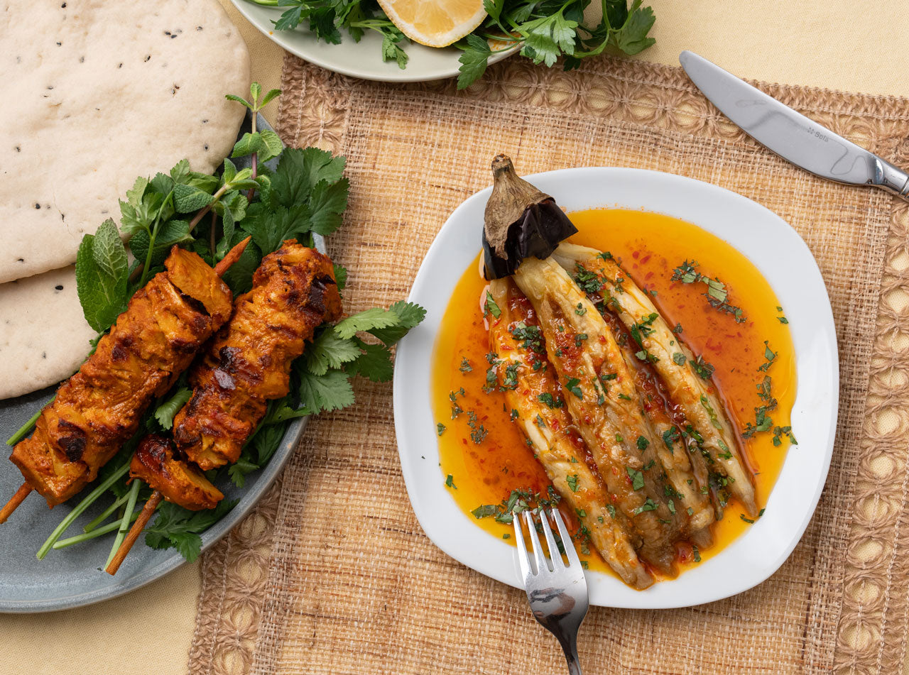 planted.émincé brochettes Tandoori & aubergine grillée